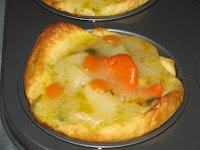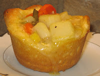Place cooked chicken in the bottom of each little pot pie and then spoon the veggies and gravy over it (almost to the top).Place the muffin pan on a cookie tray and bake in preheated 375 oven for 20 minutes or until golden brown and bubbly.