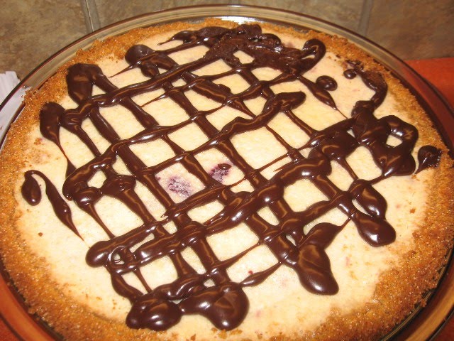 Last week, Debbie, over at Mocha Me, posted a raspberry cream cheese pie that sounded quick, easy and tasty. It had a chocolate crumb crust, a layer of fresh raspberries, a baked cream cheese filling and a chocolate drizzle.